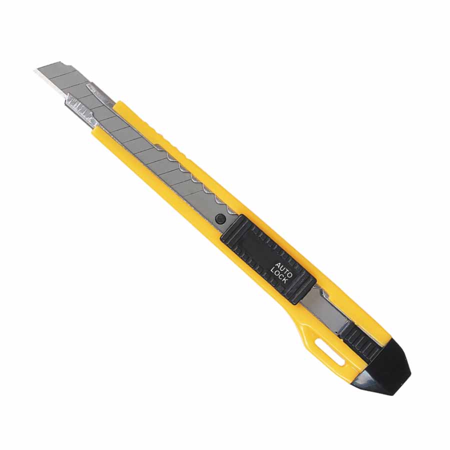 nóż biurowy do rozcinania różnych materiałów wysuwane 7-częściowe ostrze z możliwością odłamywania stępionych części blokada unieruchamiająca ostrze obudowa wykonana z polistyrenu (żółte elementy) i ABS'u (niebieskie elementy) ostrze wykonane ze stali hartowanej szerokość ostrza: 18mm długość ostrza: 100mm kolor niebiesko-żółty