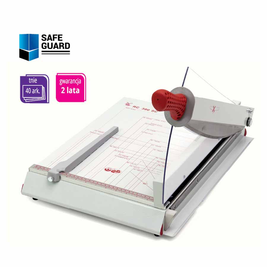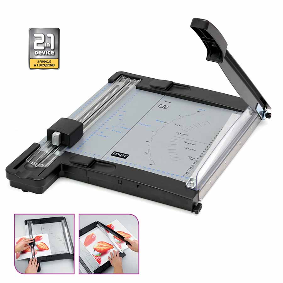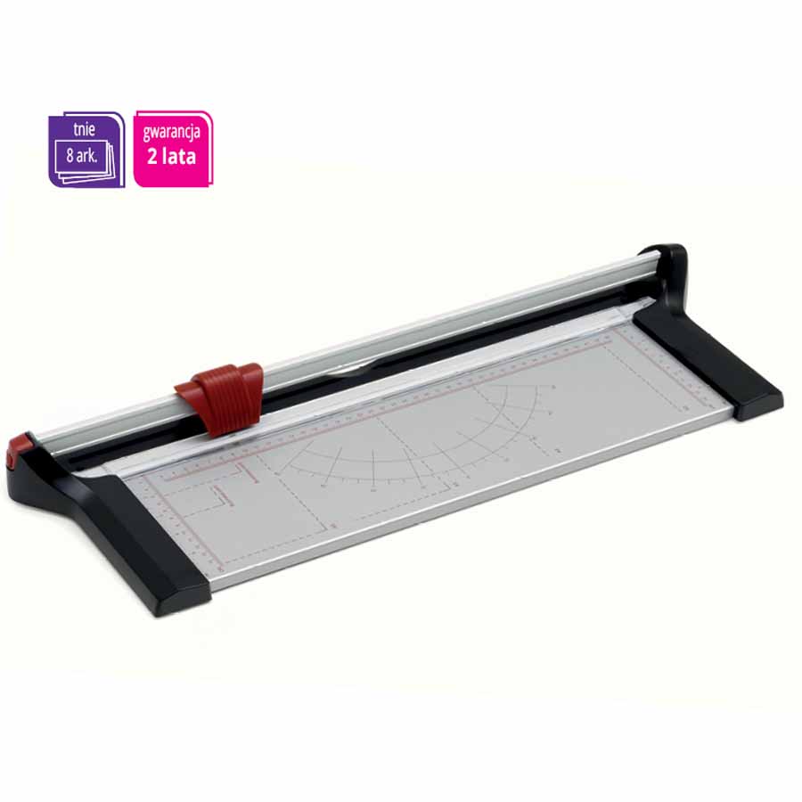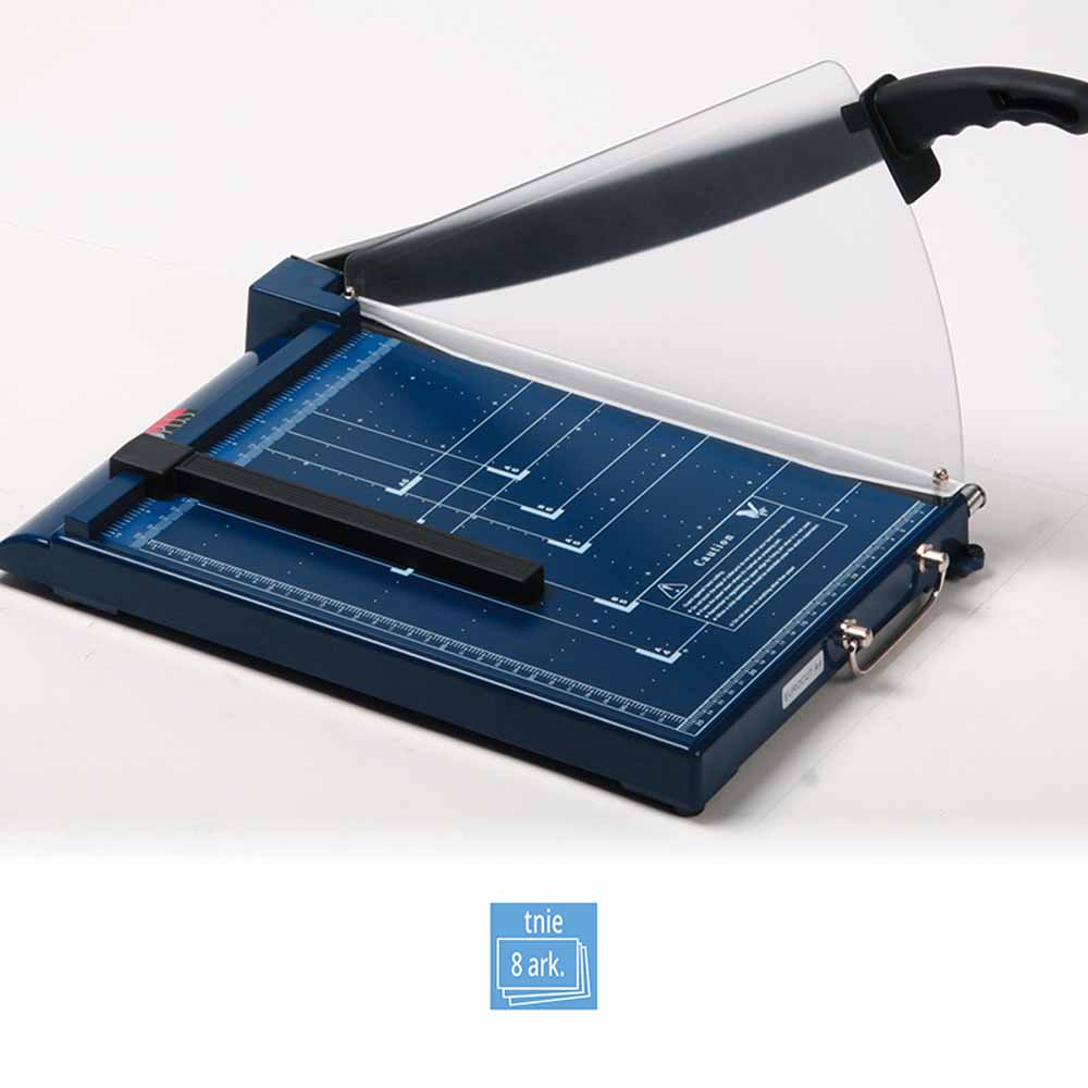 Urządzenie jest idealne do cięcia nie tylko papieru, ale także kartonu oraz cienkiej blachy. Dzięki standardowym szablonom formatów na blatach roboczych, ustawienie odpowiednich wymiarów jest szybkie i proste, co znacznie przyspiesza pracę. Gilotyna umożliwia jednorazowe cięcie do 12 kartek (70g), co czyni ją praktycznym narzędziem w codziennych zadaniach biurowych.