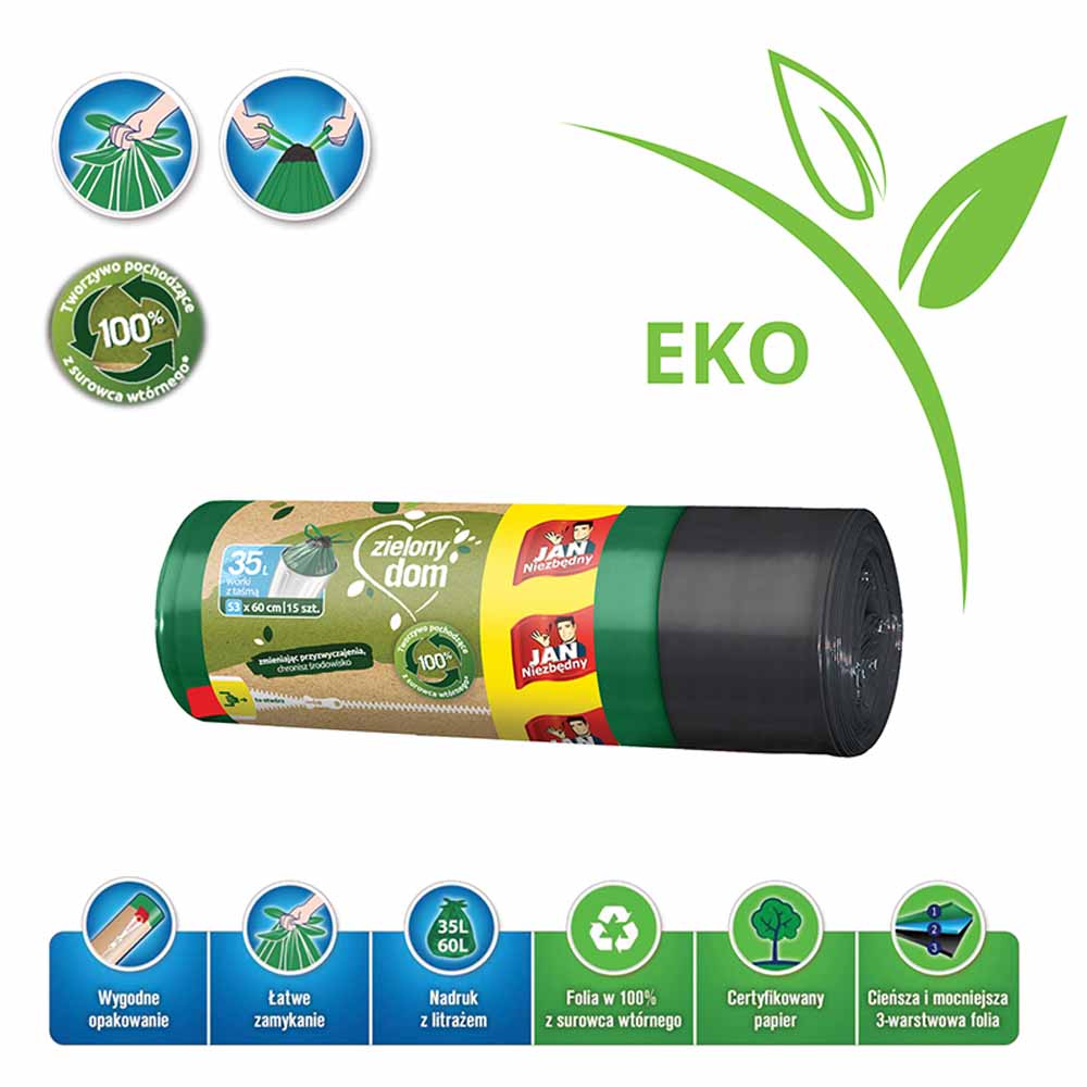 Do uniwersalnego zastosowania w domu i ogrodzie. Folia użyta do produkcji worków pochodzi w 100% z recyklingu.